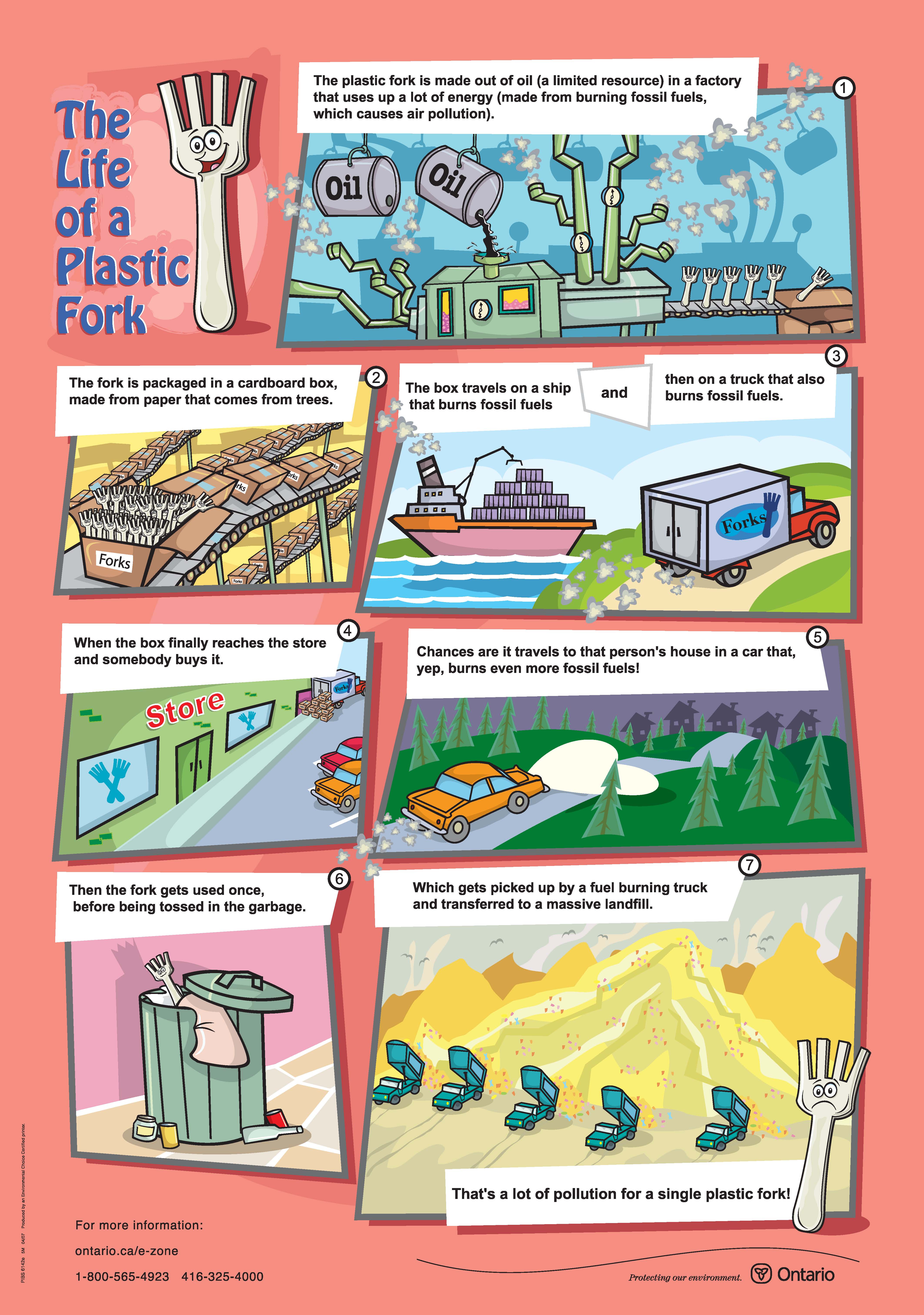 If you find that one a little too accusatory, the Ontario Ministry for the Environment has a more neutral and child-friendly poster about the life of a plastic fork which is available as a downloadable PDF here.